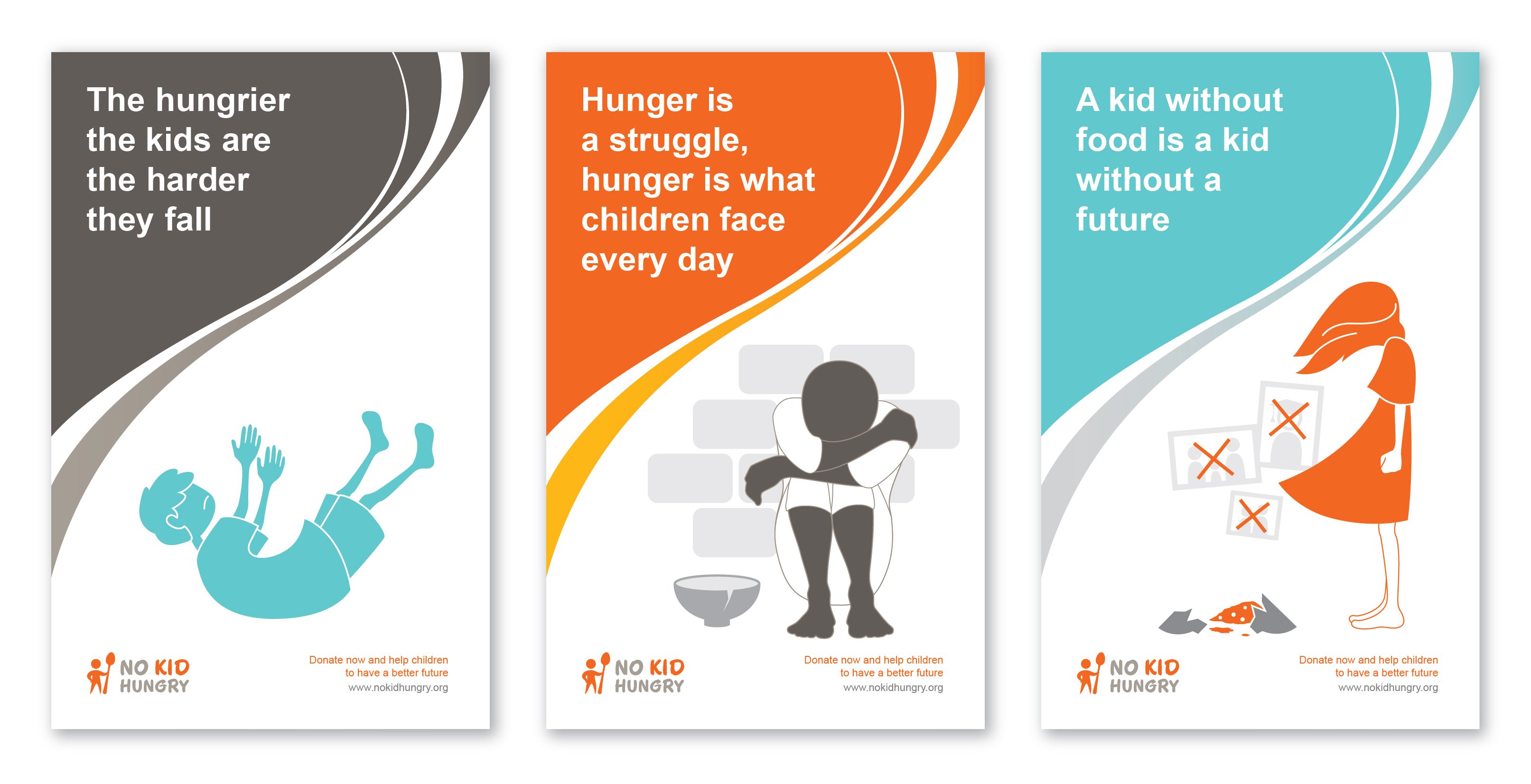 No Kid Hungry is a national campaign led by Share Our Strength. Its goal is to raise money to end childhood hunger. I made three posters showing different aspects of how not having food can negatively affect children's lives. I also redesigned the logo, but kept the similar aspect from the original. The only changes are the illustration and the font. Instead of an apple core, there is a child holding a large spoon, standing proudly to give a sense of hope.