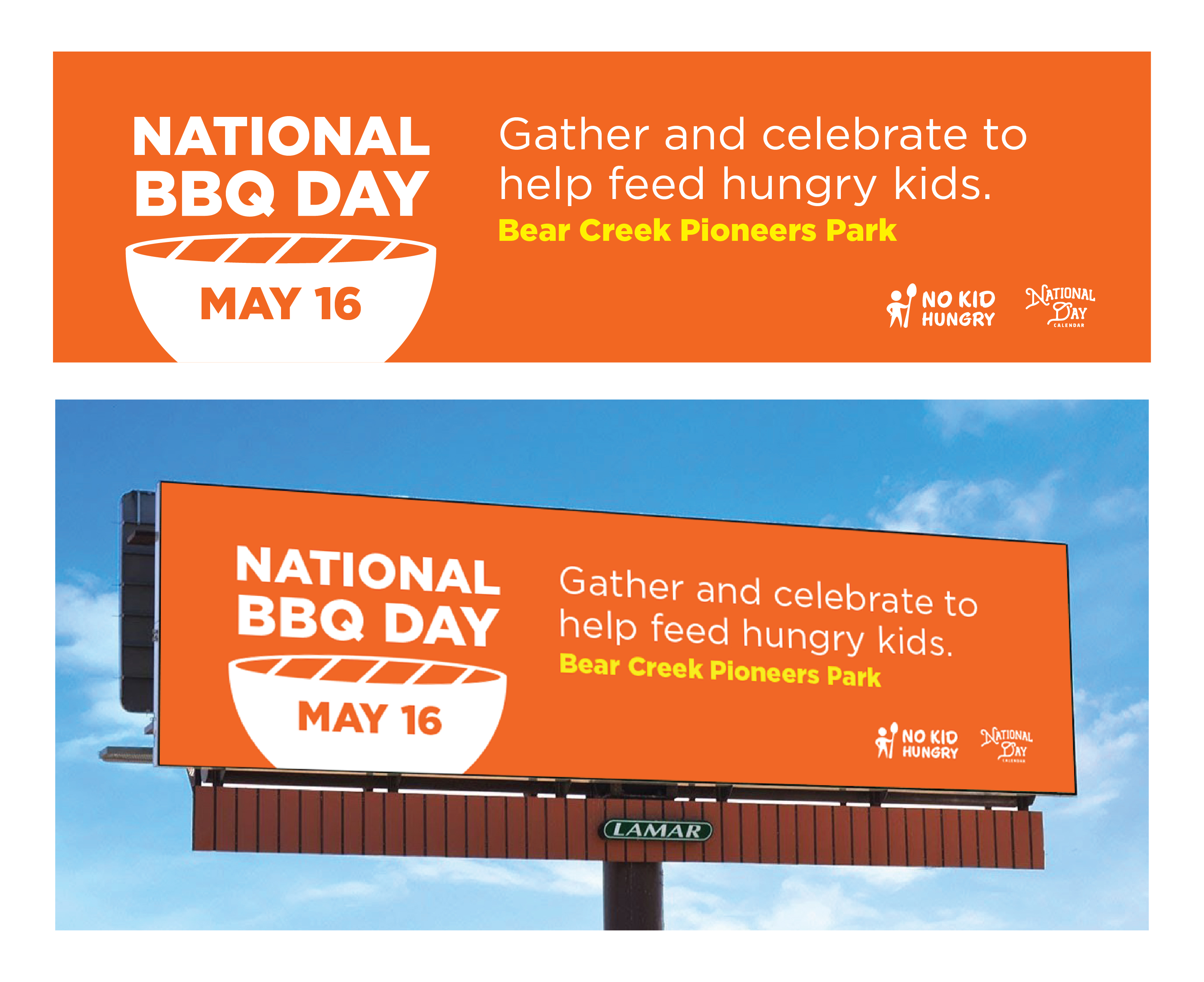 The billboard advertises a national barbecue event, encourages people to attend, and helps feed children in need. The event will take place on May 16th at Bear Creek Pioneers Park. These parks also have playgrounds and green spaces, making them ideal for families with young children. The illustration is the barbecue grill, while the text is the food ready to be cooked. I also added another logo to show the collaboration with National Day Calendar.
